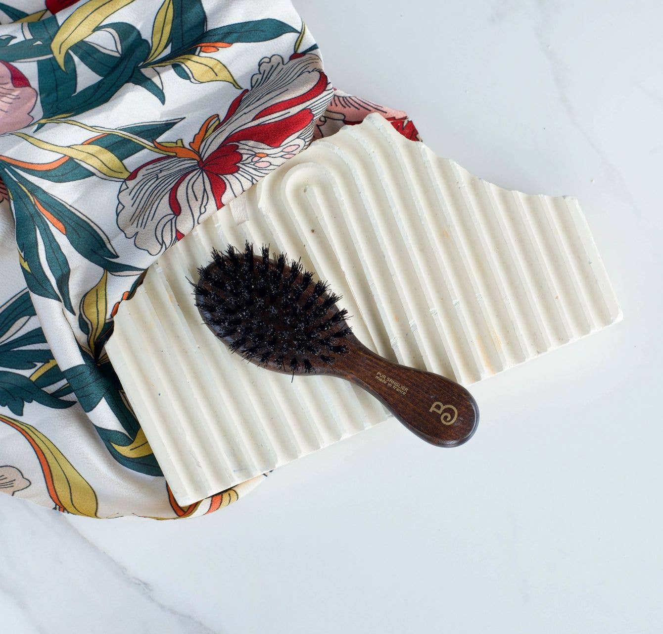 Les poils de sanglier, naturellement riches en kératine, lissent la fibre capillaire, apportent brillance et douceur, et aident à répartir harmonieusement les huiles naturelles du cuir chevelu. -